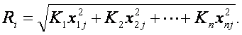 Полученные коэффициенты возводятся в квадрат и умножаются на весовые коэффициенты Кi, определяемые экспертным путем. По каждому региону результаты складываются, из найденной суммы извлекается квадратный корень, в результате чего получается рейтинговая оценка региона (Ri):