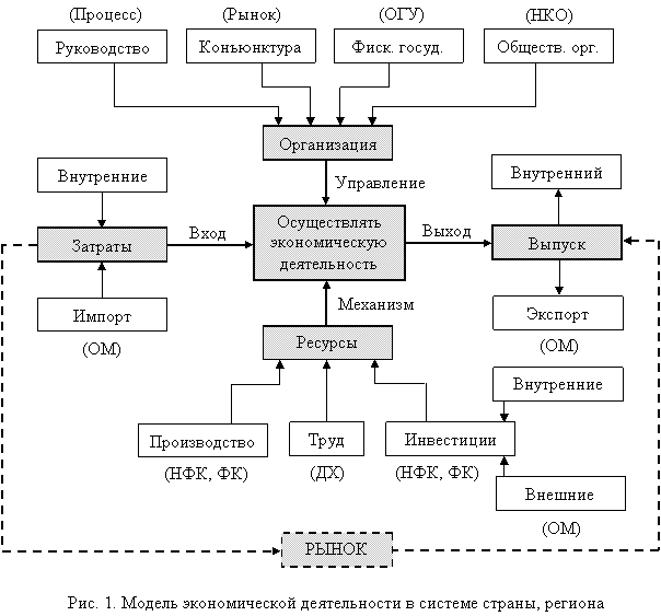 Воспользуемся моделированием экономической системы страны, региона в форме непрерывного процесса воспроизводства. Модель экономической деятельности в такой системе представлена на рис. 1.