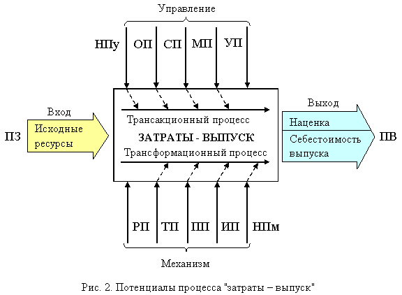 Схема процесса "затраты - выпуск" построена на основе соблюдения законов сохранения в экономической системе. При этом общий экономический потенциал выхода равен взвешенной сумме составляющих потенциалов входа, управления и механизма.