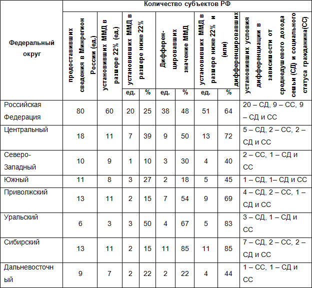 - в 7 субъектах РФ региональный стандарт МДД установлен в размере ниже 22% и дифференцируется по различным основаниям.