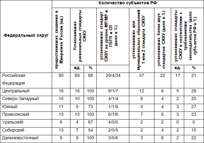 1. для муниципальных образований в разрезе городских и сельских поселений. Это требование выполнили только 34 субъекта РФ, которые продифференцировали свои стандарты до уровня городских и сельских поселений. В 29 субъектах РФ стандарты СЖКУ установлены на уровне муниципальных районов, в 4 – на уровне муниципальных районов с выделением некоторых городских и сельских поселений;