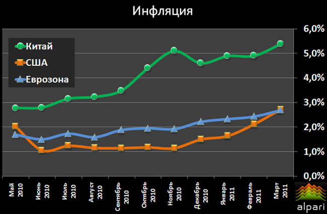 Китайская экономика в 1 квартале 2011 года показала годовой прирост ВВП на уровне 9.7%. Годовой прирост промышленного производства составил в марте 14.8%, а розничные продажи за последний год выросли на 17.4%, что выше уровней февраля, но все же ниже уровней 2010 года. Но наиболее интересная тема сейчас инфляция в Китае, производственные цены за последний год выросли на 7.3% - максимум с сентября 2008 года. Потребительские цены за последний год выросли на 5.4%, цены на продукты питания прибавили на 11.7%. Банки продолжают увеличивать объемы кредитования, за март прирост кредита составил 679 млрд. юаней ($103.4 млрд.) и достиг 47.57 трлн. юаней ($7.55 трлн.), что составляет около 125% от ВВП. После этого Народный банк Китая снова повысил норму резервирования на 0.5%, четвертый раз в текущем году. На таком фоне йена смогла восстановиться и имеет возможности продолжить рост.