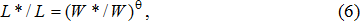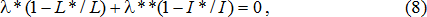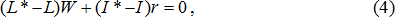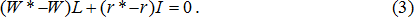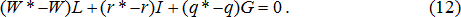 Соотношение (2) показывает образование чистого дохода в соответствии с массой и эффективностью макрофакторов, а формула (1) – расходование чистого дохода на вознаграждение макрофакторов в соответствии с их массой и фактически установившимися ценами. Объединение соотношений (1) и (2) позволяет получить следующее фундаментальное уравнение искажения равновесных цен на рынках труда и капитала: