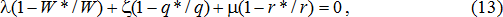 Как и в предыдущем случае, соотношение (11) описывает образование дохода под действием трех факторов, а соотношение (10) – его расходование на оплату данных факторов. Соотношения, стоящие в скобках в формуле (11), представляют собой равновесные цены соответствующих макрофакторов: