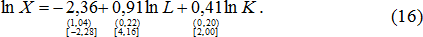 Для экономики США за 1987-2000 гг. была построена производственная функция Кобба-Дугласа в виде следующей эконометрической зависимости5: