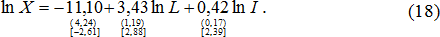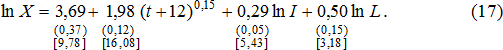 Ее особенность состоит в том, что помимо двух основных факторов производства в нее вводится трендовый компонент6. Такая модификация базовой зависимости не нарушает условий процесса моделирования и не ведет к каким-либо погрешностям. Учитывая основные статистические тесты, эконометрическая зависимость (17) в целом может быть признана работоспособной7.