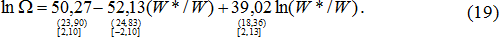 Регрессионная зависимость (19) успешно проходит все тесты, включая t-статистики коэффициентов регрессии при уровне значимости в 90%, и может использоваться в дальнейшем анализе национального рынка труда США. Следовательно, между показателями уровня занятости и коэффициентом искажения равновесной цены существует устойчивая связь.