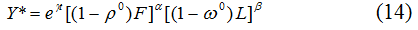 Зависимость (20) является более предпочтительной, нежели тождества (18) и (19), так как аккумулирует в себе оба макрофактора, дозагрузка которых сопряжена с дополнительным производственным эффектом. Заметим, что аналогичная производственная функция может быть построена эконометрически. Однако в такой функции показатели эффективности труда и капитала оказываются постоянными на протяжении всего интервала исследования величинами, в то время как зависимость (20) оперирует меняющимися производительностями. Объем потенциального ВВП для производственной функции (20) вычисляется по формуле: