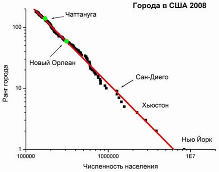 Рис.2. Современная ранжировка городов США (без пригородов; рассчитано по данным wikipedia.com). Как видно, Лос-Анджелес (второй город), Чикаго (третий) и Хьюстон (четвертый) располагаются на «регрессе».