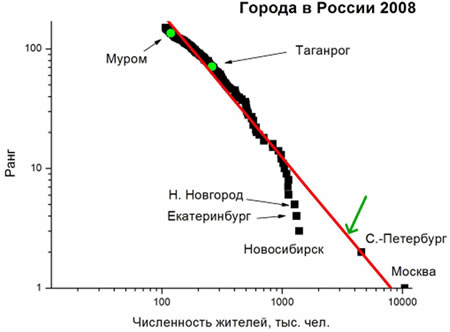 Рис.4. Современная ранжировка городов России по числу жителей (по данным Росстата). Зеленая стрелка указывает уместную позицию Третьего Города.
