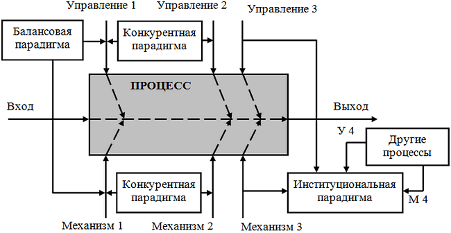 Институциональная парадигма – сопряжение, достижение комплиментарности между элементами управления и механизмами группы процессов. Данная парадигма является близкой к балансовой, и в то же время не отвергает действия конкурентной парадигмы. Институциональная парадигма представляет собой некую интегральную структуру обеспечения соответствующего процесса.