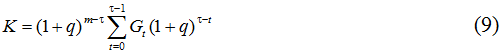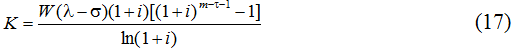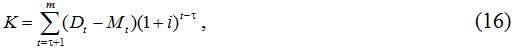 В основе формулы (16) лежит представление о том, что кредит гасится через m лет после взятия его первой порции, причем погашение производится полностью, а не по частям. Одновременно с этим мы предполагаем, что первые годы после окончания учебы заемщик живет чрезвычайно скромно, довольствуясь минимумом; остальные деньги он копит для погашения кредита. Процесс накопления ускоряется за счет депозитного дисконта i. Как в теории, так и на практике в качестве величины M может использоваться не только прожиточный минимум, но и вообще любая величина, обеспечивающая накопление необходимой суммы для возврата долга; прожиточный минимум нами используется для большей конкретизации и наглядности проводимых в дальнейшем расчетов.