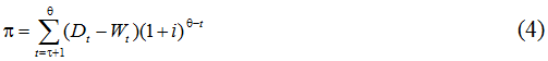 Для оценки совокупного дохода π, получаемого от инвестиций в образование, необходимо сопоставить доходы Wt, которые человек мог бы получать в течение жизни после окончания срока учебы, не имея образования, с доходами Dt, который он будет получать, имея образование. Разница между этими величинами должна дисконтироваться на протяжении всего периода времени от момента завершения учебы до момента выхода на пенсию. Учитывая сказанное, полный приведенный доход от образования π для случая кредитных средств может оцениваться точно также, как и для случая собственных средств [1]: