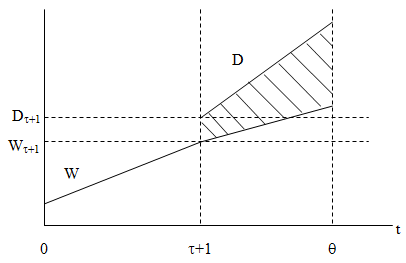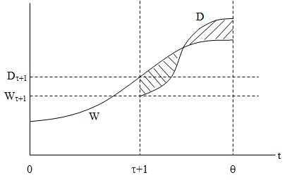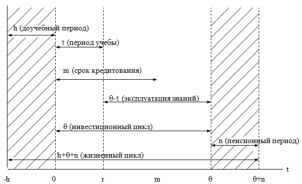 В нашем анализе фигурируют три основные временные характеристики: τ – период учебы, m – время возврата кредита и Θ – время выхода индивидуума на пенсию. Данные величины являются главными слагаемыми жизненного цикла человека. Однако определенного комментария заслуживает способ их учета. Дело в том, что нулевой период в нашей схеме сопряжен в моментом начала учебы и дальнейший отсчет времени идет именно от этой точки. Срок погашения кредита составляет величину, которая складывается из периода учебы τ и послеучебного периода m–τ, в течение которого человек «отрабатывает» полученный заем. Временной интервал от начала учебы до момента выхода индивида на пенсию Θ представляет собой инвестиционный (можно сказать, учебно-производственный) цикл, в рамках которого протекает вся его активная деятельность. Соответственно, период Θ–τ предназначается для эксплуатации полученных навыков и знаний и именно на этом отрезке жизненного пути человека происходит формирование нормы прибыли от вложений в образование.