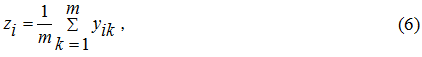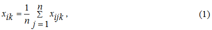 Шаг 1. Выведение среднего балла. Первичной информацией рейтинга являлся показатель xijk – оценка j–ым экспертом i–го форума по k–му критерию; i=1,…,29; j=1,…,37; k=1,…,7. Тогда усреднение балла по каждому рейтингу, т.е. свертка по всем экспертам с получением агрегированной величины xik, осуществляется по формуле: