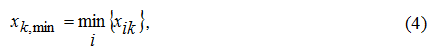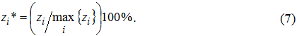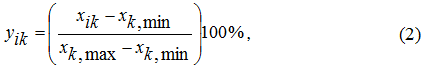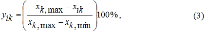 Так как масштаб у разных факторов может быть сильно различающимся, то их следует все пронормировать в однотипных единицах измерения – от 0 до 100%. Это автоматически достигается с помощью формул (2)-(5).
