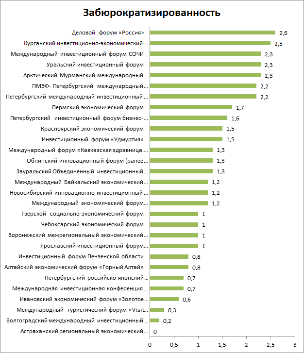 Кроме того, обращает на себя внимание тот факт, что уровень забюрократизированности, во-первых, слабо различался между форумами, а во-вторых, везде был сконцентрирован в нижней части шкалы. Это означает, что фактор бюрократии и излишней зарегламентированности не является сдерживающим для региональных участников. Отсюда вытекает еще один предварительный, но очень важный вывод о том, что региональные инвестиционные форумы являются по-настоящему демократическим институтом, как это изначально и задумывалось. Это факт, вне всякого сомнения, является чрезвычайно обнадеживающим.