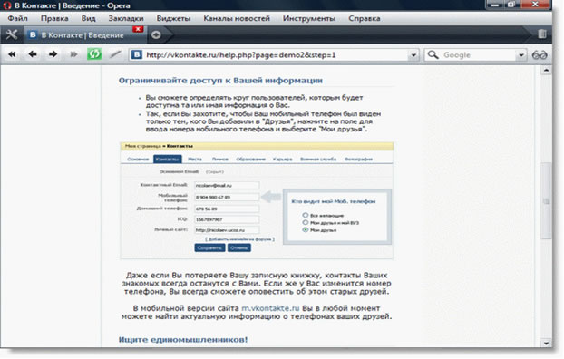 В контакте. Быть в контакте только с теми, с кем хочется общаться позволяет социальная сеть "В контакте" (http://vkontakte.ru/). Это социальная сеть с группами, друзьями, сообщениями, поиском и т.д. На главной странице сайта нас встречает пошаговый мастер, который наглядно демонстрирует все достоинства сети. Например, свои данные, такие как телефон и e-mail лучше всего показывать только друзьям. И сервис позволяет сделать это (рис.10).