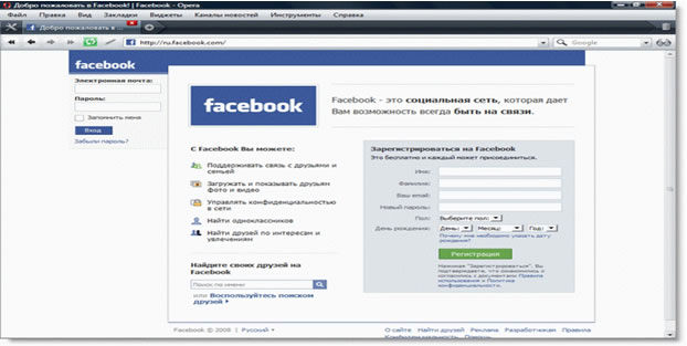 Рис.13. Сервис Facebook доступен и на русском языке.