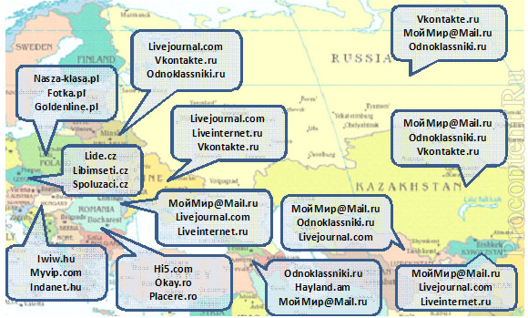 В странах СНГ лидируют российские социальные сети: на первое место выбрались Odnoklassniki.ru, далее – Vkontakte.ru и МойМир@Mail.ru. Так, Odnoklassniki.ru первые в Армении, МойМир@Mail.ru лидирует по числу пользователей в Казахстане, Узбекистане, Киргизии и Молдове. А вот в Белоруссии и на Украине первое место занимает Livejournal.com.