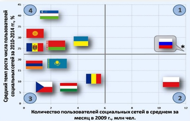 На данном этапе развитие социальных сетей в России, странах Восточной Европы и СНГ находится на разных стадиях. Для удобства аналитики J’son & Partners Consulting разделили рынки соцсетей в странах СНГ, Восточной Европы и России на четыре категории по численности аудитории социальных сетей и темпам ее роста.