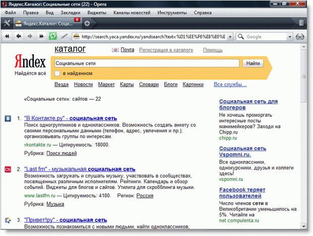 Рис. 5. Поиск социальных сетей в Яндекс-Каталоге.