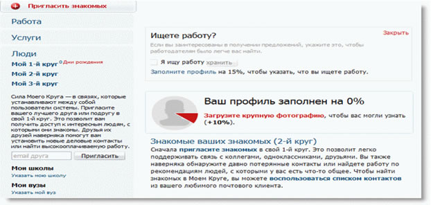 Сеть предоставляет возможность искать работу, услуги или сотрудников. Для того чтобы сообщить своему первому кругу то, что вы ищете работу, достаточно отметить галочкой "Я ищу работу" (рис.7).