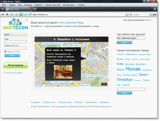 Даже без регистрации, в два клика можно увидеть всех пользователей, которые находятся с вами в одном городе. Войдя в сеть и указав свою улицу, обнаружим своих соседей и друзей. Воистину, мир тесен!