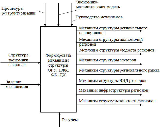 Входами процесса являются данные: "структура экономики исходная", "задание механизмов". Управлением являются нормативные документы, полученные из материнской диаграммы А0: "процедура реструктуризации", "экономико-математическая модель", "руководство механизмов". Ресурсами процесса служат финансовые, трудовые, инфраструктурные, необходимые для формирования механизмов.