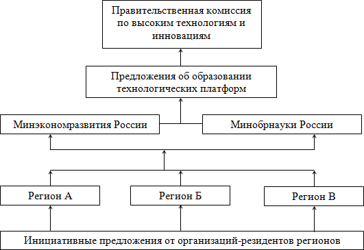 На наш взгляд, территориальная привязка технологических платформ к 6 регионам страны (преимущественно ЦФО и в значительно меньшей степени к СФО и СЗФО) свидетельствует о непродуктивности самого подхода инициирования технологических платформ, осуществленных на федеральном уровне по принципу «сверху – вниз». Более результативным представляется принцип формирования заявок на создание технологических платформ «снизу – вверх», когда инициативы исходят из регионов в федеральный центр (рис.1).