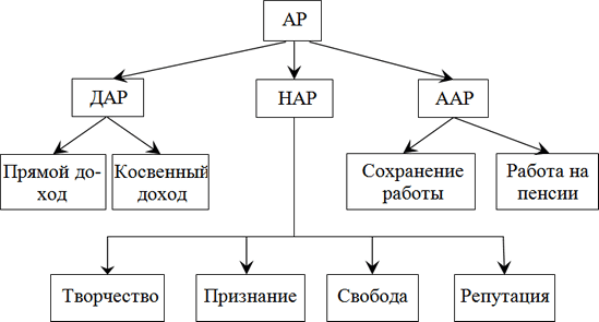 В связи с тем, что научная карьера подразумевает длительное обучение, часто исходят из того, что вложения времени, сил и денег в академический опыт представляют собой вложения в человеческий капитал и равносильны обычным инвестициям, приносящим определенный доход – процент. По крайней мере, такое понимание идет еще с работ Г.Беккера [4]. Это означает, что усилия человека по приобретению академических навыков позволяют ему получать более высокую зарплату в будущем. Данный прирост заработков и обеспечивает искомый процент, который может трактоваться в качестве академической ренты. На самом деле, на практике вычисление подобной величины представляет собой самостоятельную и довольно сложную проблему. Однако ситуация осложняется еще и тем обстоятельством, что помимо чисто денежного эффекта часто рассматривается нематериальный эффект от академической деятельности. Иногда это явление называют академической рентой (АР), иногда – академическим вознаграждением [3]. На наш взгляд, во избежание терминологических неясностей имеет смысл ввести следующие понятия.
