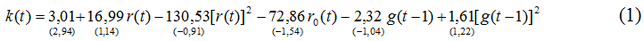 Во-вторых, вызывает сомнение линейность связи. С общетеоретической точки зрения совершенно ясно, что для формирования курса имеет не только (а может быть, и не столько!) разрыв в процентных ставках, но и величина самих ставок. Совершенно очевидно, что функционирование валютного рынка в условиях чрезвычайно низких ставок сильно отличается от режима с предельно высокими ставками даже, если процентный дифференциал при этом одинаков. Кроме того, интуитивно ясно и другое: «вес» и значение процентных ставок неодинаково. Вполне логично предположить, что валютный курс, формирующийся внутри страны, более чувствителен к внутренней процентной ставке, нежели к зарубежной. Данный аргумент подводит к пониманию того, что валютный курс должен зависеть от процентных ставок нелинейно.