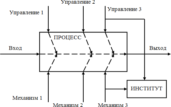 На схеме процесса вход преобразуется в выход под действием управления 1, 2 с использованием механизмов 1, 2. При этом управление 3 (традиции, законы, нормы, требования) оказывается сопряженным с механизмом 3 (система обеспечения традиций, законов, инструменты установления и определения норм, ресурсы обеспечения требований). В результате становится целесообразным усиливать взаимодействие одноименного управления и механизма в едином структурном образовании – институте.