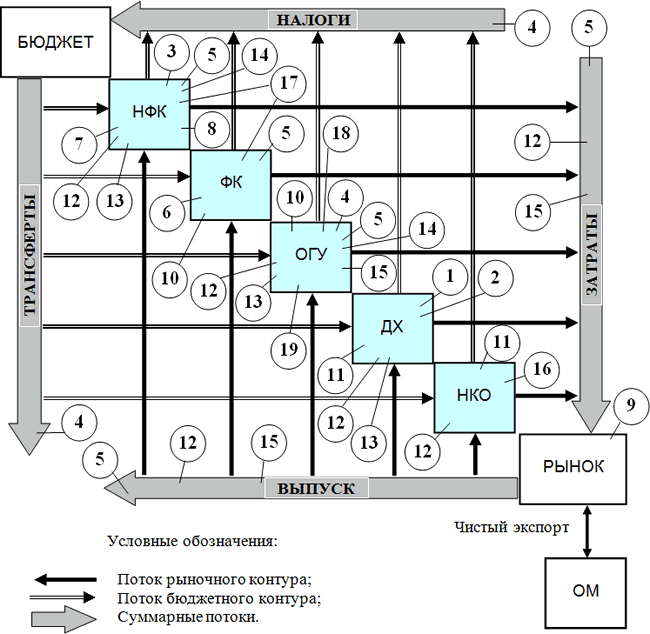Институциональный сектор ОМ связан с рынком потоками чистого экспорта. При этом экспорт является потоком выпуска экономической системы, который через рынок поступает в ОМ. Импорт представляет поток затрат экономической системы, который через рынок направляется в ОМ.