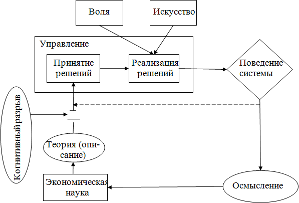 Однако описанный цикл познания и управления таит в себе массу подводных камней. Дело в том, что построение теорий как некий творческий акт в ряде случаев может выйти из-под контроля и превратиться в самодостаточную деятельность – исследователь делает акцент на описании системы, не предполагая ее последующего использования в управлении. Именно это и произошло в Economics за последние несколько десятилетий. В этом случае когнитивный цикл на рис.1 разрывается, а процессы описания системы и управления ею становятся автономными, не связанными друг с другом. В дальнейшем такой эффект будем называть когнитивным разрывом между описанием и управлением (КРОУ).