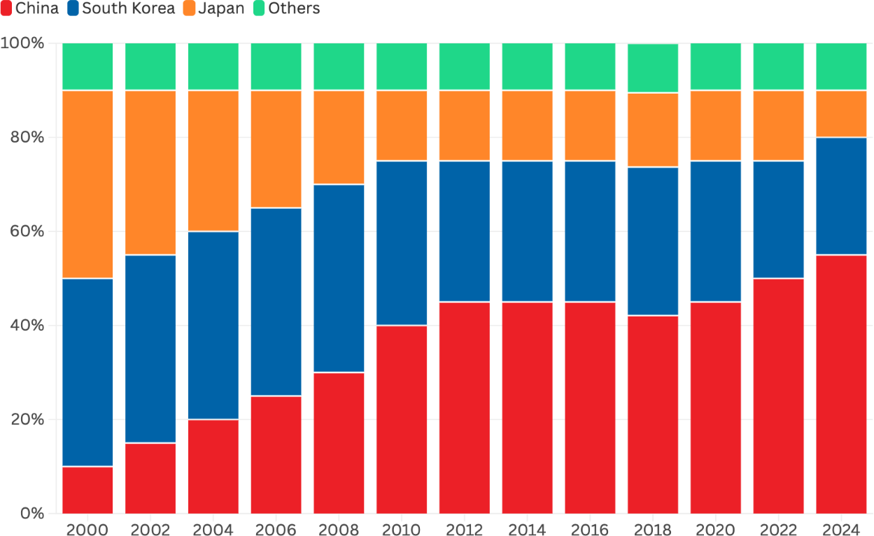 Судостроительная промышленность Америки столкнулась со стратегическим кризисом. Десятилетия упадка, вызванные провальной политикой глобализма, превратили Соединенные Штаты из ведущего мирового судостроителя в 1975 году в сегодняшнего мелкого производителя с 19-м местом в мире. А вот Китай последние два с половиной десятилетия методично расширял свое судостроение и привел его к мировому господству посредством государственной промышленной политики, масштабных субсидий и стратегических инвестиций. США в настоящее время производят менее пяти крупных коммерческих судов (т.е. крупных океанских судов водоизмещением более 1000 регистровых тонн) в год, в то время как Китай строит более 1700 судов в год. Более того, на долю Пекина в настоящее время приходится более 50% мирового рынка судостроения по сравнению с примерно 5% в 2000 году (Рисунок 1).
