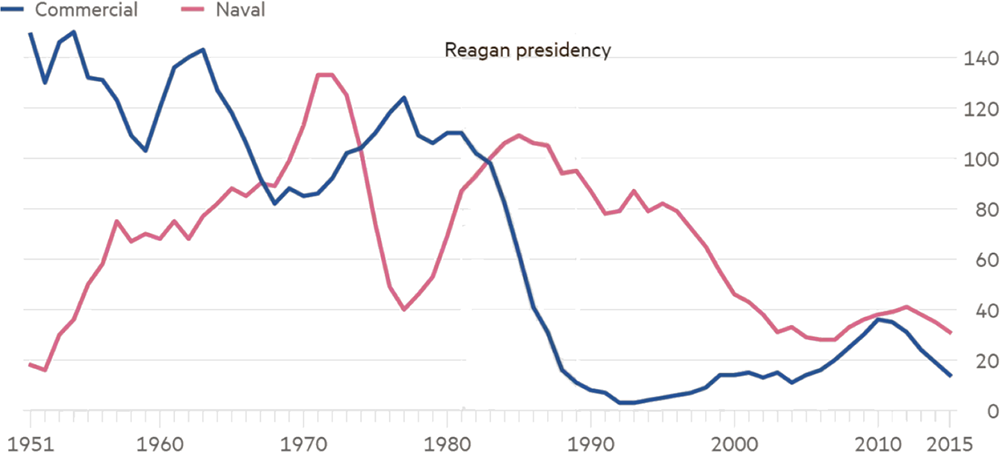 Разрушение американского гражданского судостроения началось в 1980-х годах, вызванное либерал-глобалистской экономической политикой рейганомики, лишившей отрасль критически важной государственной поддержки. В 1982 году администрация Рейгана прекратила федеральные субсидии на судостроение, что привело к практически мгновенному краху рынка коммерческого судостроения США. После того, как администрация Рейгана отменила субсидии на судостроение, объём производства в США упал с примерно 20 крупных океанских коммерческих судов в год до всего пяти в течение следующих восьми лет, при этом доля Америки в мировом торговом тоннаже упала с 1,1% в 1988 году до всего 0,25% к концу 1990-х годов.