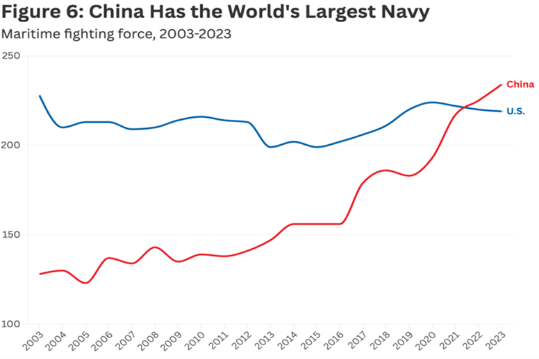 В результате эффективность китайской судостроительной промышленности набрала такие обороты, что Поднебесная империя к началу 2020-х годов опередила США по количеству судов военно-морских сил. Да, это невероятное историческое событие уже свершилось! США перестали быть крупнейшей военно-морской державой, а Китай уже может похвастаться крупнейшим и самым быстрорастущим военно-морским флотом в мире: по состоянию на 2023 год в его составе было 234 боевых корабля против 219 у ВМС США (Рисунок 3).