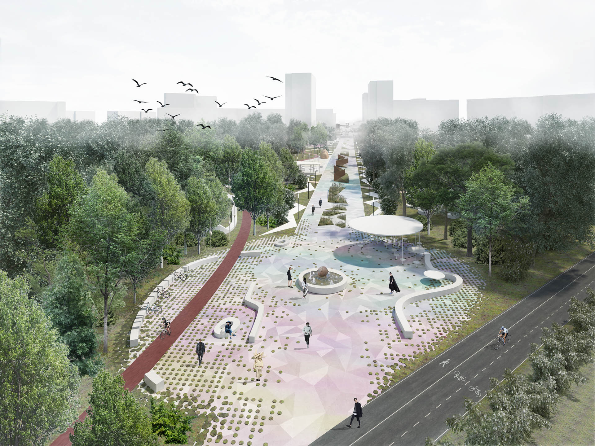 Т.О.: Да, разделение потоков, разделение зон – тихие и шумные зоны, и зоны перед магазинами и парками… Это очень разнообразный бульвар. Он уникальный во многом, потому что это не классический бульвар с транспортными полосами, а чисто пешеходный бульвар, который ведет из огромного парка в самое сердце города. Он полностью пешеходный и должен был преобразиться путем локальных интервенций, но объединенных в единый стилистический букет.