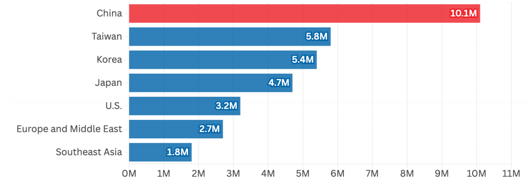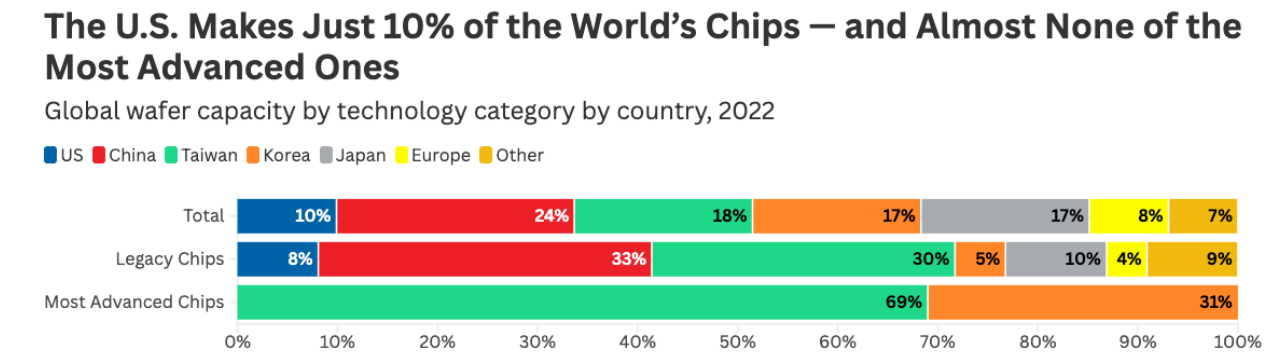 Но еще более захватывающая ситуация с производством чипов по двум категориям: традиционные чипы (legacy chips) размером не менее 28 нанометров; и передовые чипы размером менее 10 нанометров.